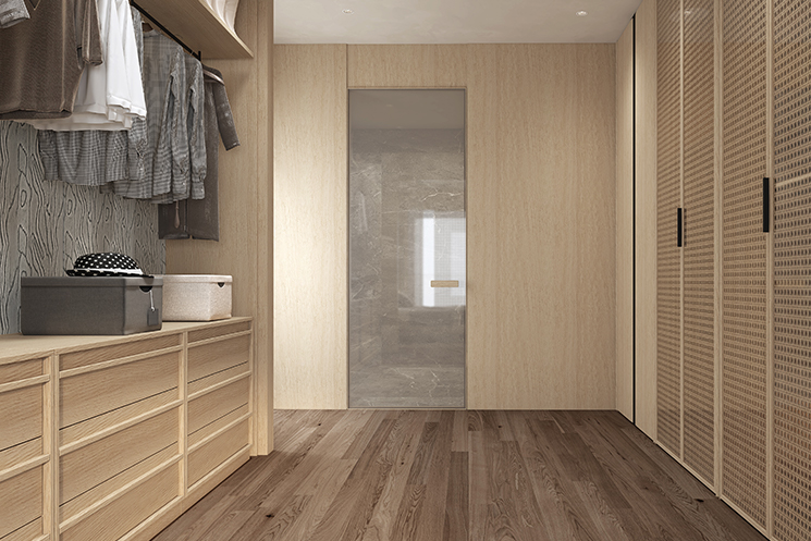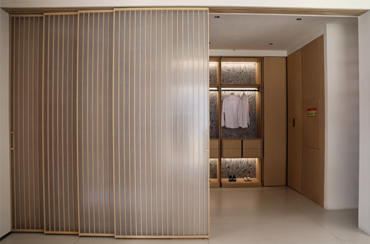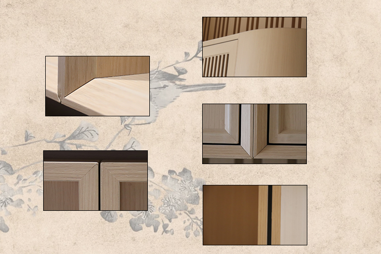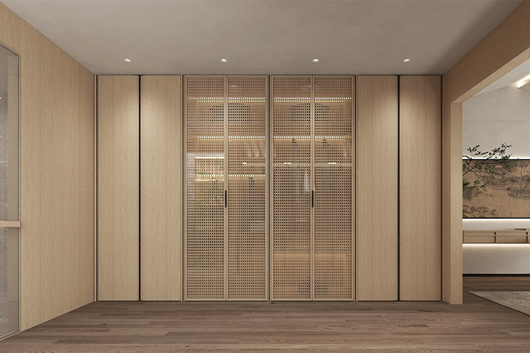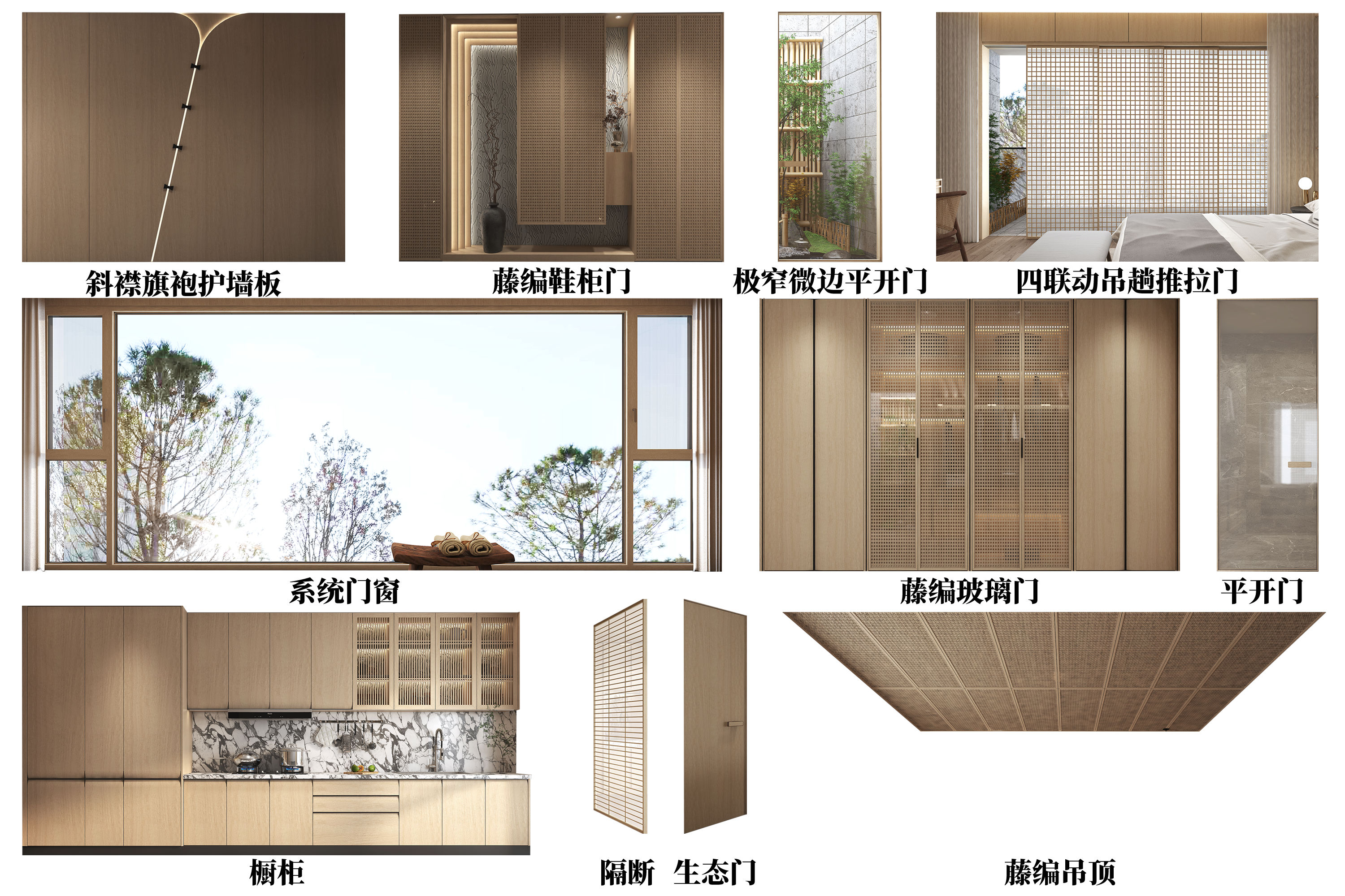 斜襟旗袍护墙板、藤编鞋柜门、极窄微边平开门、四联动吊趟推拉门、系统门窗、藤编玻璃门、平开门、橱柜、隔断、生态门、藤编吊顶等全系同色。