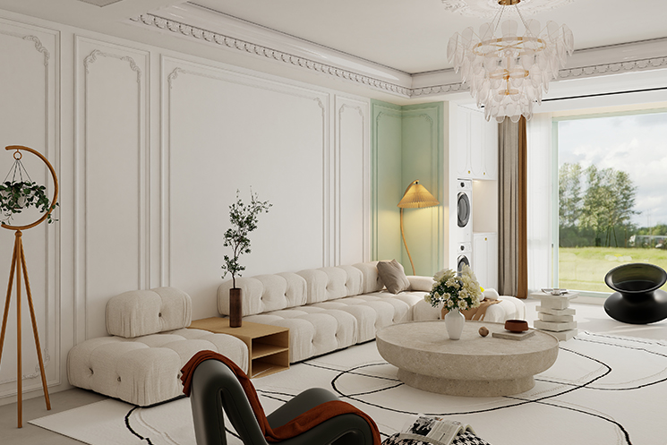 “尘翠绿”系列以柔和绿色为主调,通过个性化定制打造专属空间。墙面与地板色调材质灵活调整,嵌入式柜体兼顾储物与美学。沙发、茶几尺寸材质可定制,满足不同户型需求。绿植与装饰画自由搭配,彰显个人风格。落地窗优化采光,整体设计优雅自然,兼具实用与美观,为用户营造舒适、独特的居住体验。