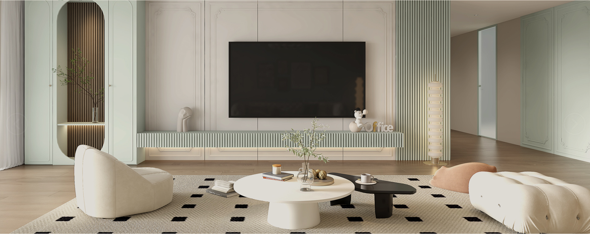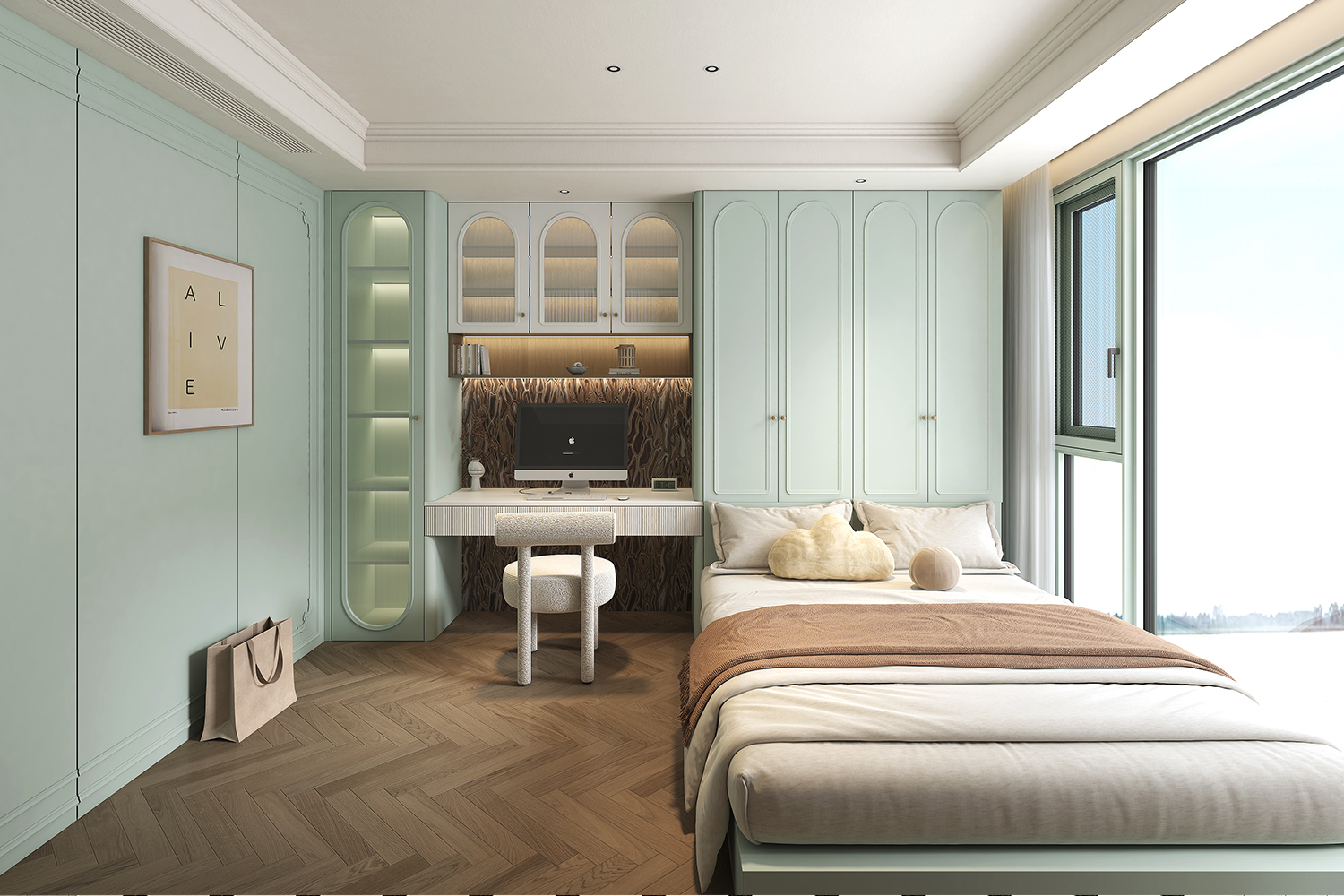 “尘翠绿”系列以自然的绿意为灵感,将优雅与宁静融入现代空间设计,营造出一种诗意的生活氛围。浅绿弧形衣柜门如涟漪般柔和,开放式书架与封闭式衣柜结合,功能与美学兼备;木质地板与冷色调墙面形成对比,自然与现代对话。地毯上的书籍与懒人沙发,邀请时光停驻。以“留白”为美学核心,用弧线、玻璃与自然材质构建清新宁静的诗意空间,让生活回归本质,宛如一首无声的诗。
