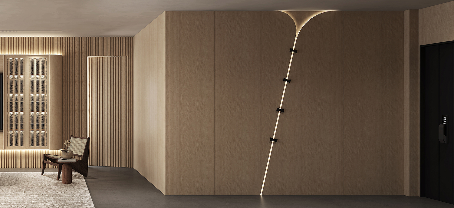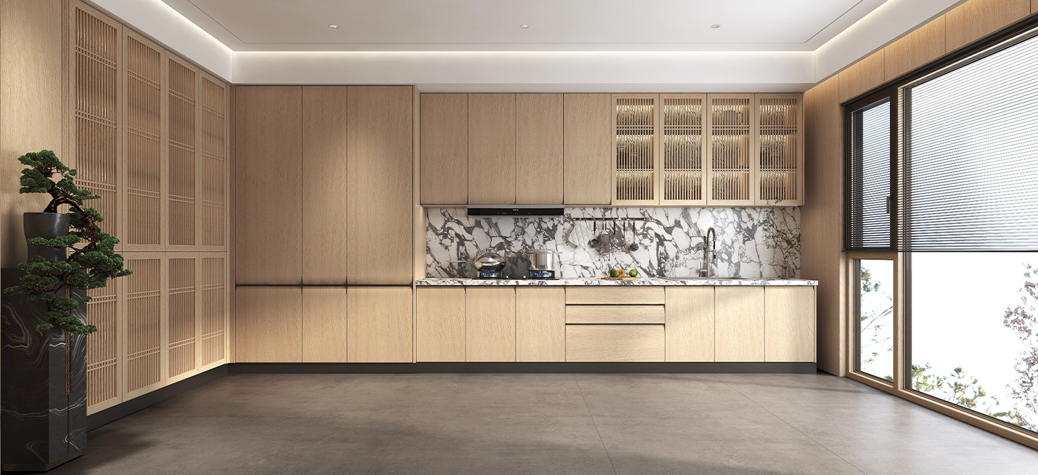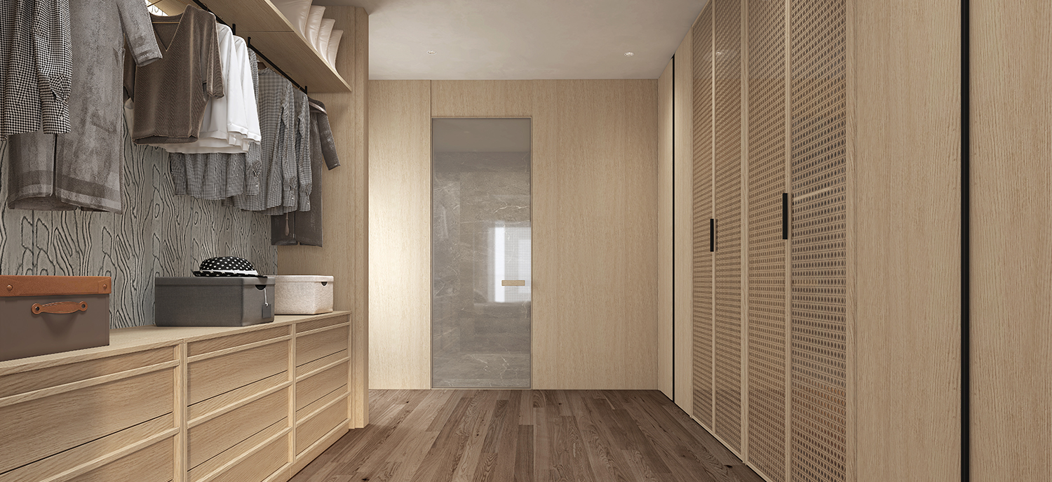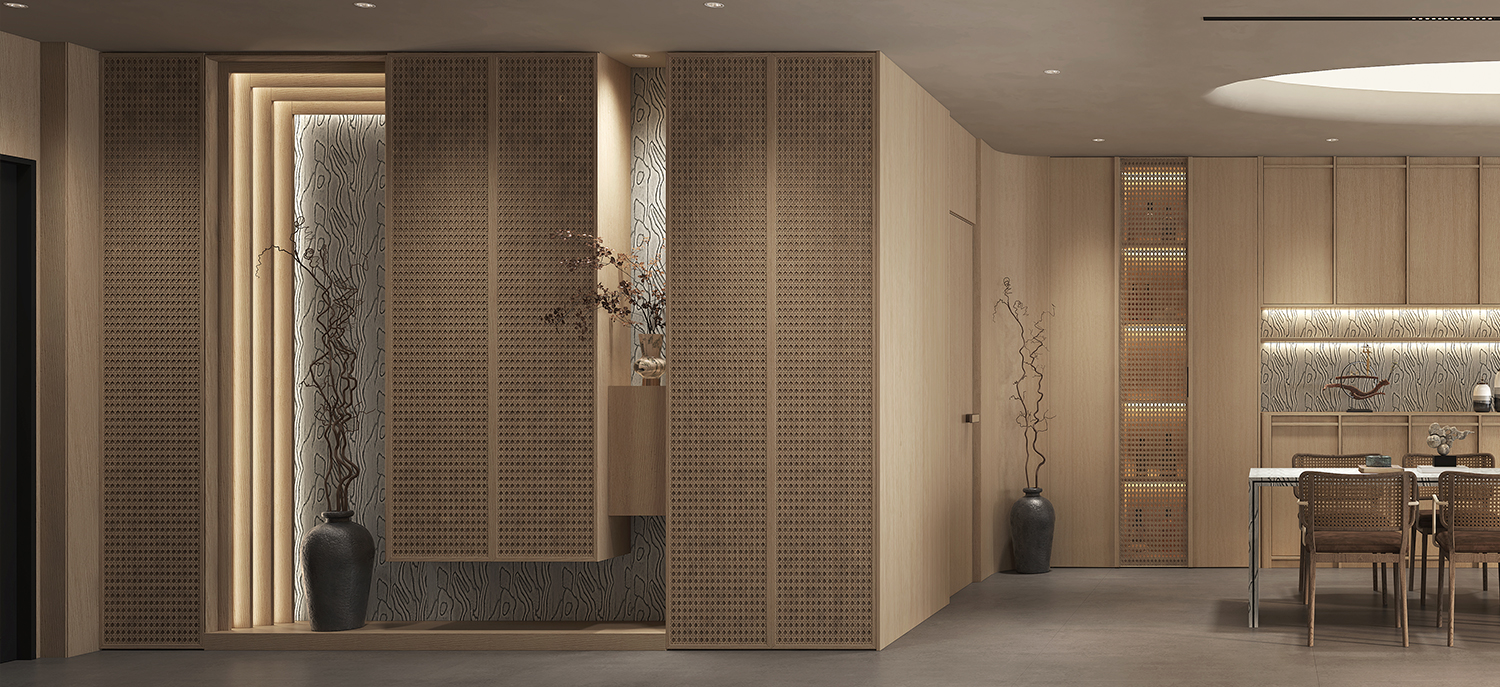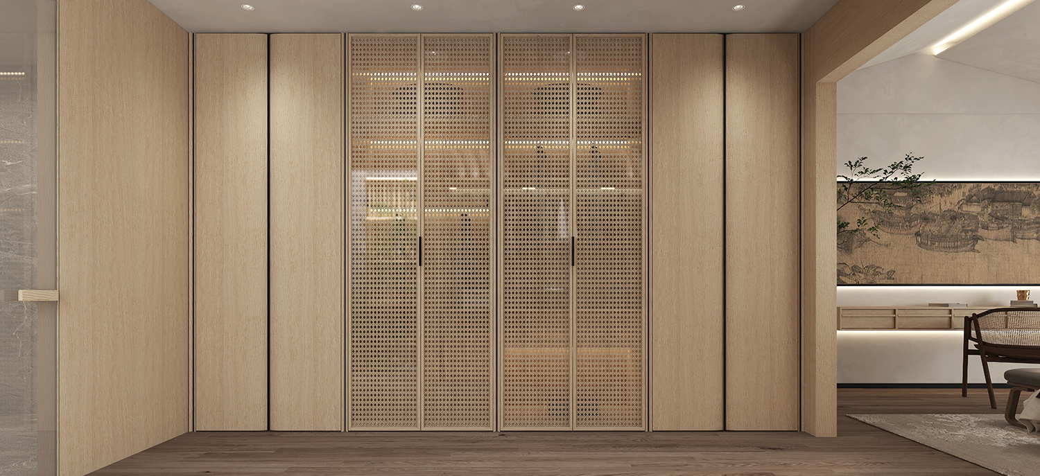 斜襟旗袍护墙板、藤编鞋柜门、极窄微边平开门、四联动吊趟推拉门、系统门窗、藤编玻璃门、平开门、橱柜、隔断、生态门、藤编吊顶等全系同色。