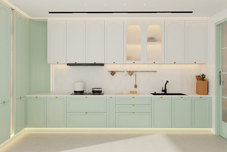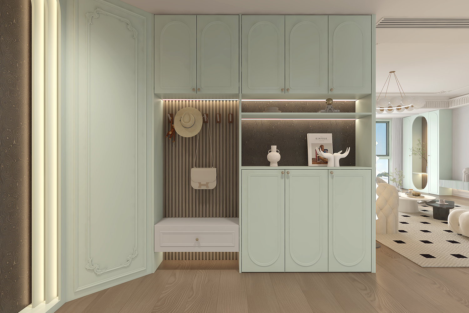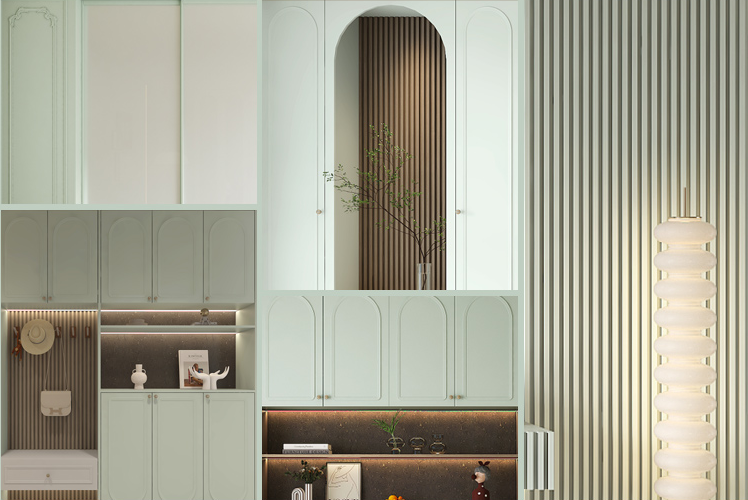 “尘翠绿”系列以精湛工艺与自然灵感交织,打造现代美学空间。圆弧设计如涟漪般柔和,采用高精度数控加工,确保弧线流畅自然。柜门选用环保浅绿板材,搭配低挥发涂料,保留天然纹理。隐藏LED灯带柔和均匀,增添现代感。墙面格栅工艺,增强层次美观感。