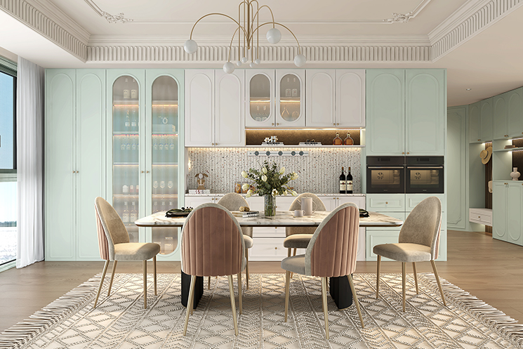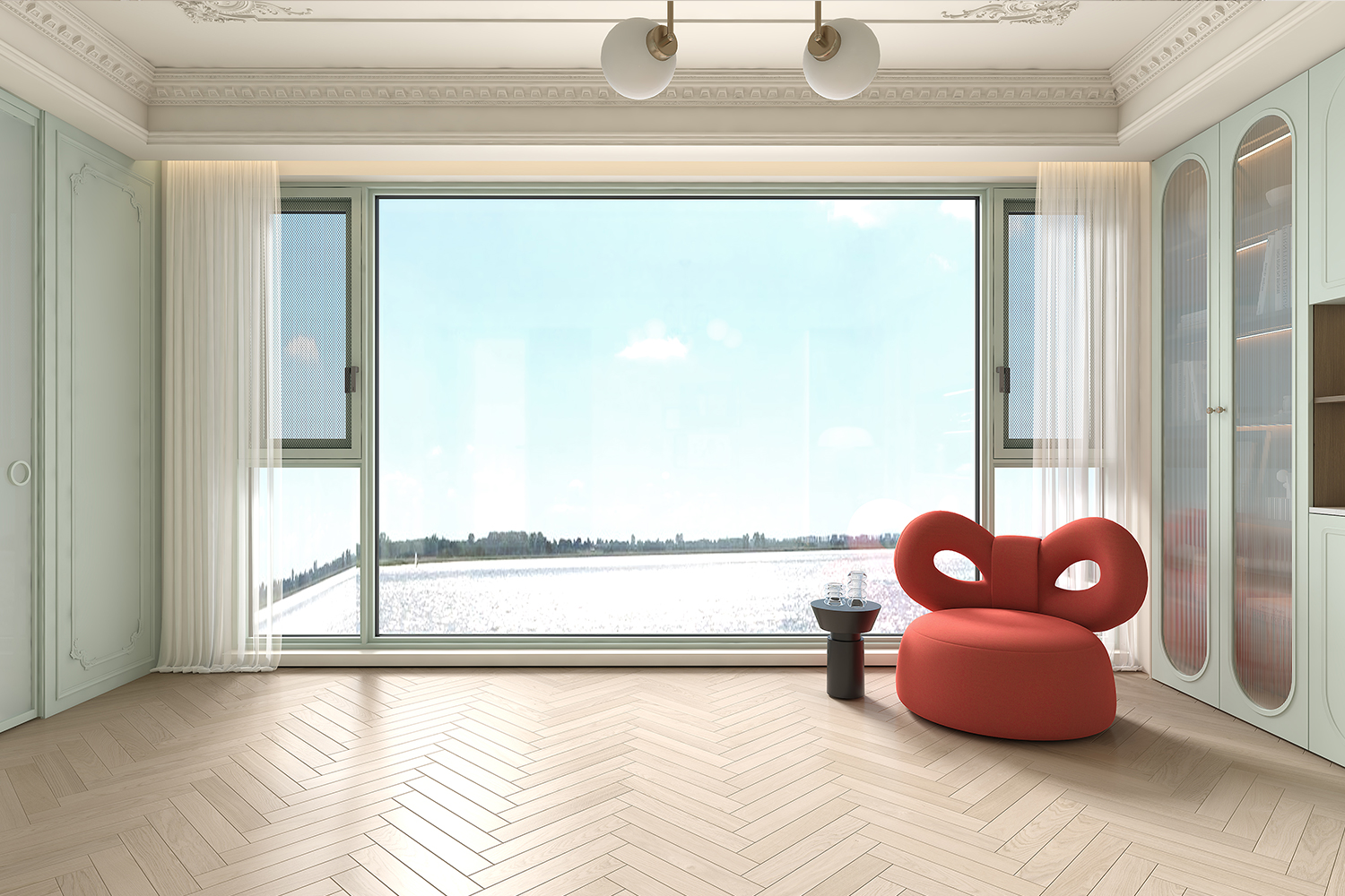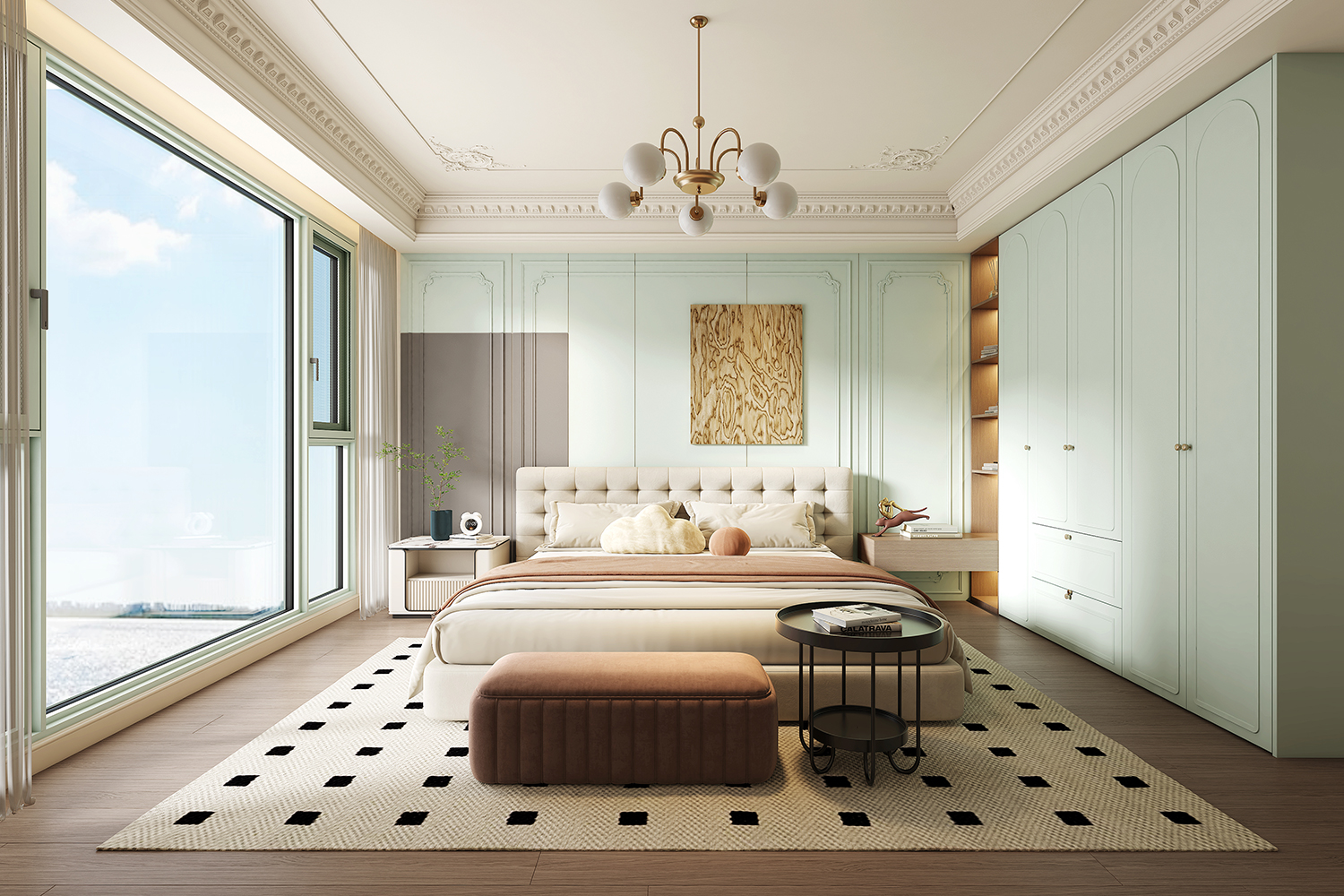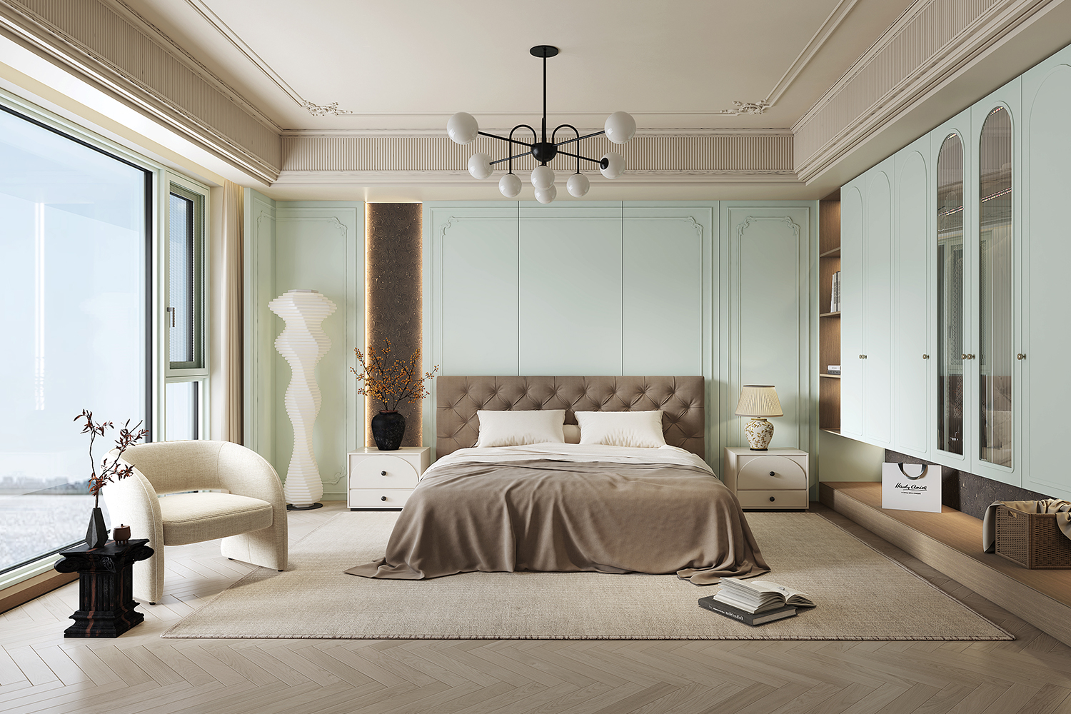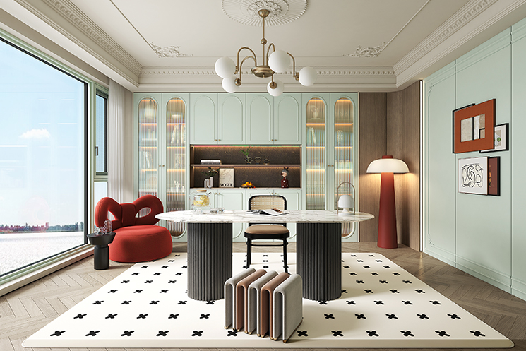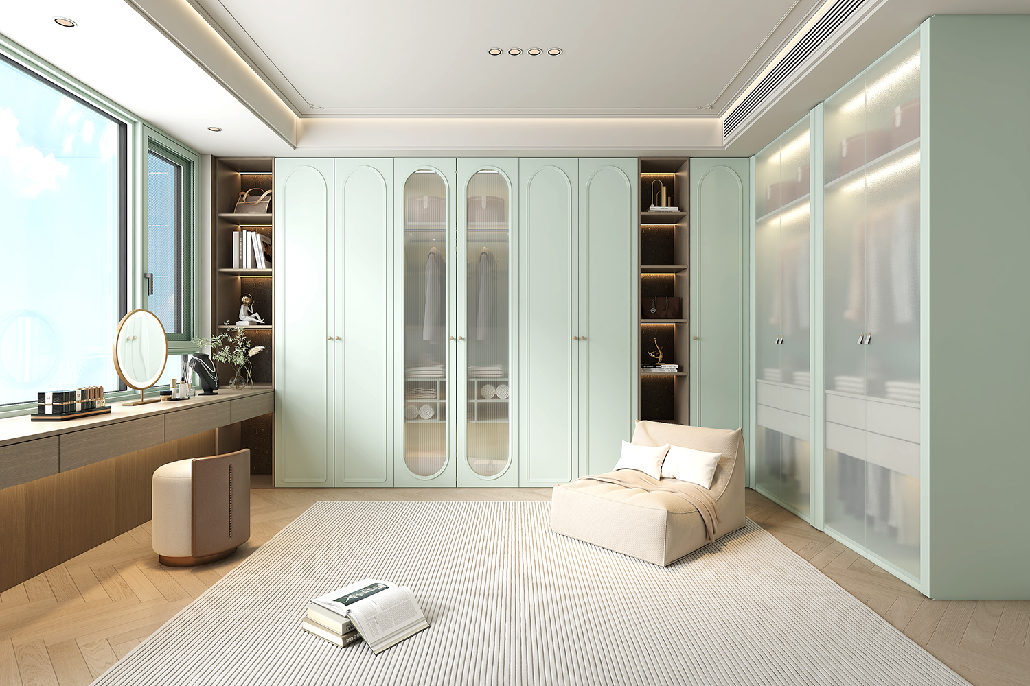 “尘翠绿”系列以自然的绿意为灵感,将优雅与宁静融入现代空间设计,营造出一种诗意的生活氛围。浅绿弧形衣柜门如涟漪般柔和,开放式书架与封闭式衣柜结合,功能与美学兼备;木质地板与冷色调墙面形成对比,自然与现代对话。地毯上的书籍与懒人沙发,邀请时光停驻。以“留白”为美学核心,用弧线、玻璃与自然材质构建清新宁静的诗意空间,让生活回归本质,宛如一首无声的诗。