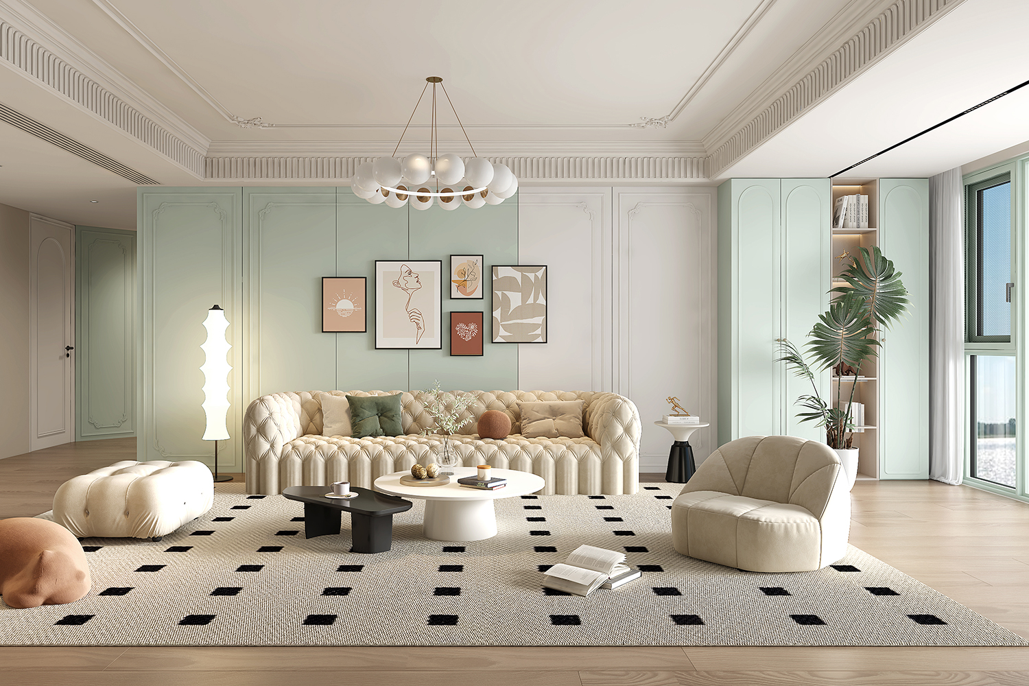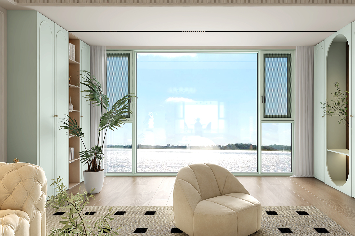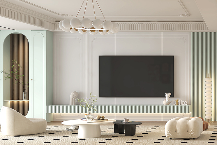 “尘翠绿”系列以柔和绿色为主调,通过个性化定制打造专属空间。墙面与地板色调材质灵活调整,嵌入式柜体兼顾储物与美学。沙发、茶几尺寸材质可定制,满足不同户型需求。绿植与装饰画自由搭配,彰显个人风格。落地窗优化采光,整体设计优雅自然,兼具实用与美观,为用户营造舒适、独特的居住体验。