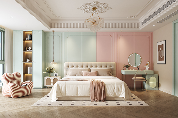 “尘翠绿”系列以柔和的绿色为主色调,结合精致的线条与简约的设计语言,营造出一种清新、自然且优雅的居住氛围。绿色墙面与木质地板的搭配,既传递出自然的气息,又赋予空间温暖与舒适感。墙面的装饰线条与嵌入式柜体设计,不仅提升了整体的层次感,还提供了实用的储物功能,满足现代生活的收纳需求。