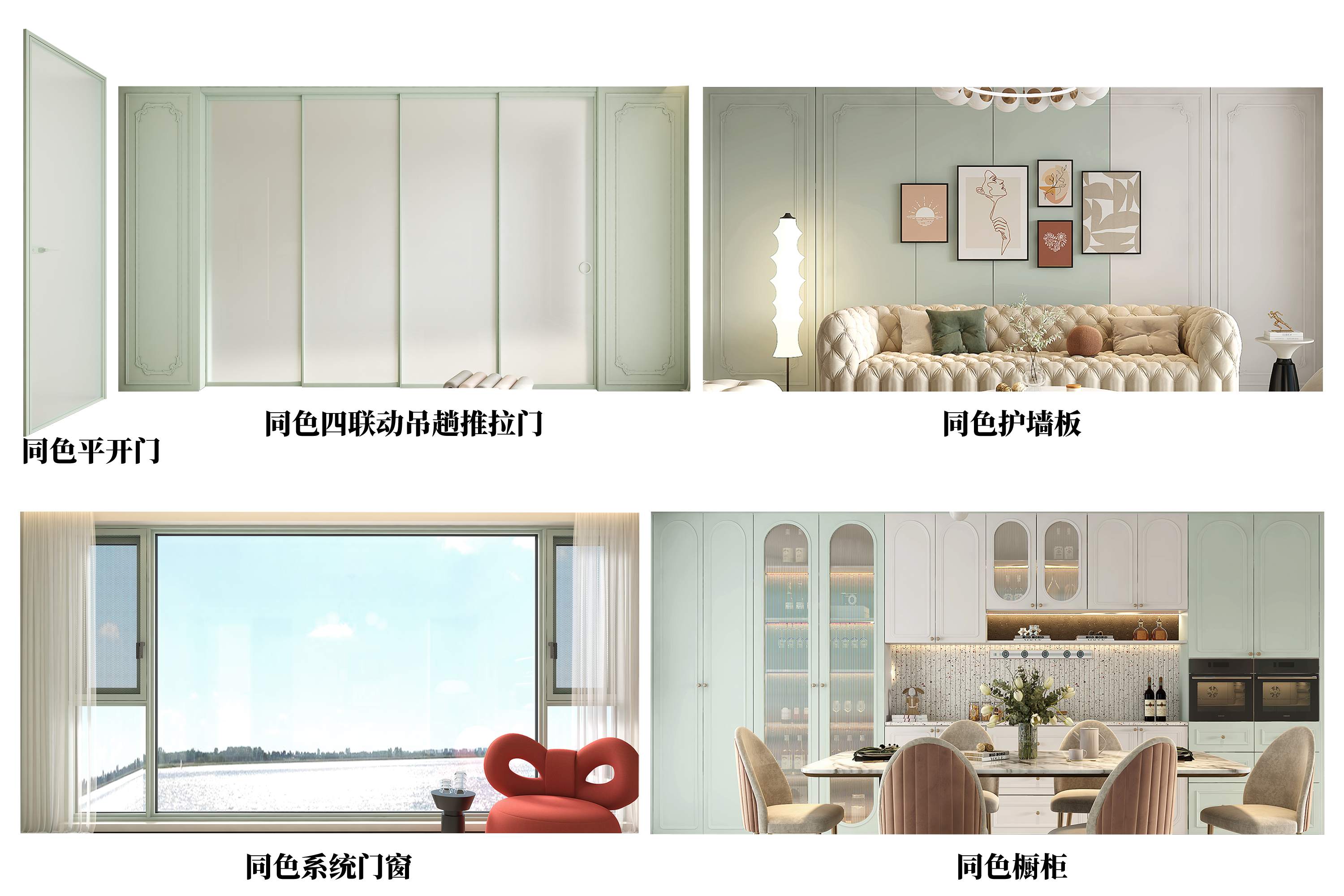 平开门、四联动吊趟推拉门、护墙板、系统门窗、橱柜等全系同色。